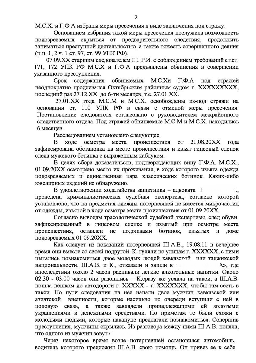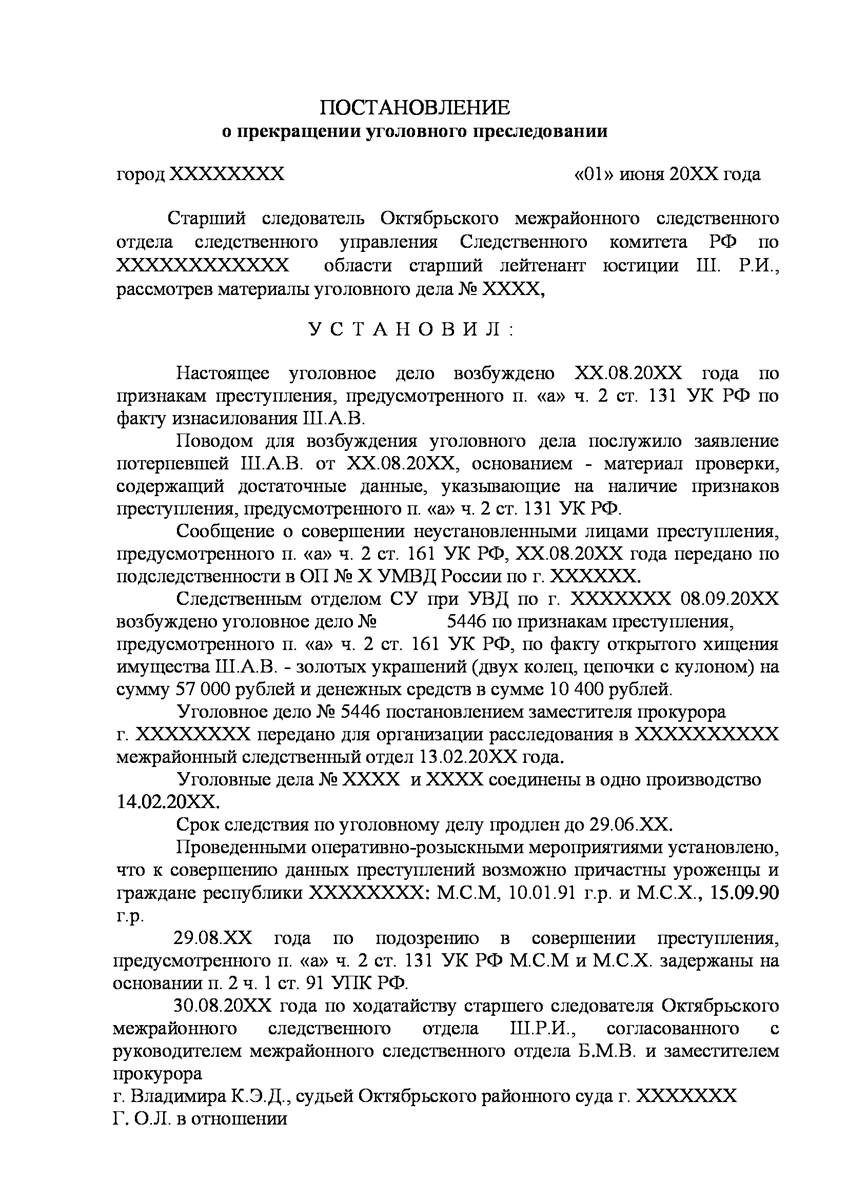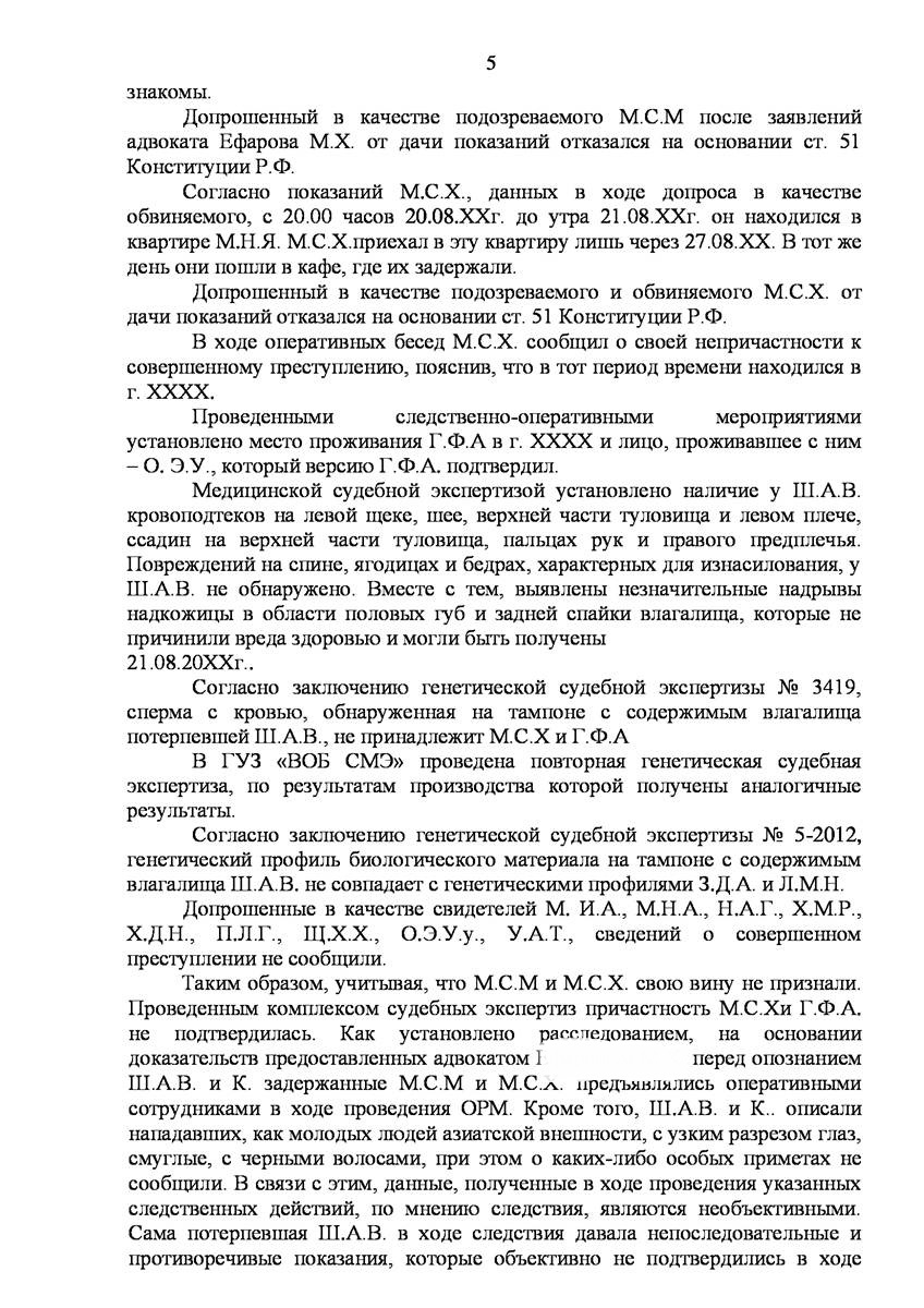 Адвокат в Зеленограде добился прекращения уголовного дела на стадии предварительного расследования по реабилитирующим основаниям в отношении двух граждан иностранного государства обвиняемых органами предварительно следствия в совершении преступления предусмотренного п. «а» ч.2 ст.131 УК РФ (изнасилование совершенное группой лиц) и п."а" , п."г" ч.2 ст.161 УК РФ (грабёж), наказание за которое предусматривает лишение свободы от восьми до пятнадцати лет, то есть преступление, которое в соответствии с ч.5 ст.15 Уголовного Кодекса Российской Федерации отнесено к категории особо тяжких преступлений.